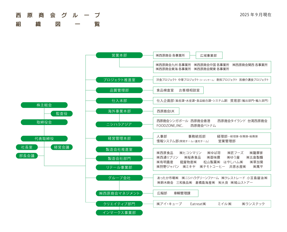 西原商会グループの組織構成は経理や人事、仕入や品質管理業務を主に行う株式会社西原商会を母体に、5つの販売会社、海外事業会社、製造会社などの複数のグループ会社から成り立っており、下記図の組織図に基づいて経営の統制を図っています。